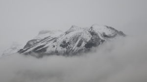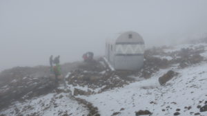 After eating some freshly prepared food, we started walking at 9:30 am. We passed through grasslands to sand, rocks, and snow. The mountain was relatively empty of climbers. We only saw only 8 other climbers during the day. On our way to Los Cien Hut, we passed four landmark portillos (rock formations). The climbing was straightforward class 2, but route finding was a challenging in the fog. My challenge was the altitude, and I had to stop periodically to catch my breath. Toward the hut, the trail flattened a bit, and the ghostly outline of the hut emerged. It felt good to reach my goal although the hut had seen better days. We took some photos, ate a little food, and descended. Hearing nearby thunder encouraged a rapid descent. My challenge on the return shifted from tired lungs to tired quads.